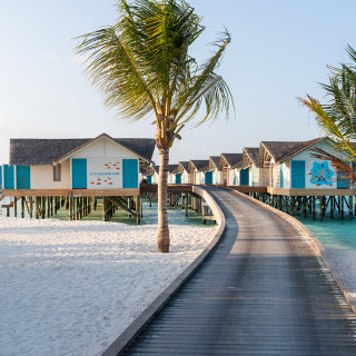 Shaped like a traditional ‘dhoni’ fishing boat, our Dhoni Loft Water Villas have an expansive lower level living area and a master bedroom on the mezzanine, making them great for families. The design is about bringing the outside space in, with floor-to-ceiling windows overlooking the water, and a private terrace touching the ocean.