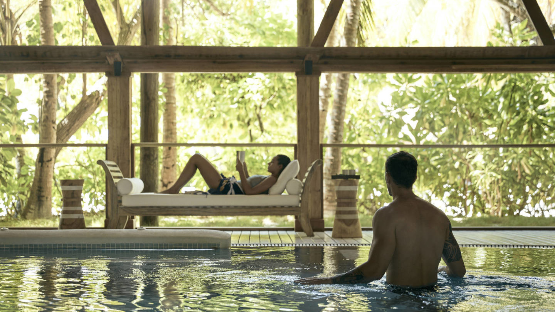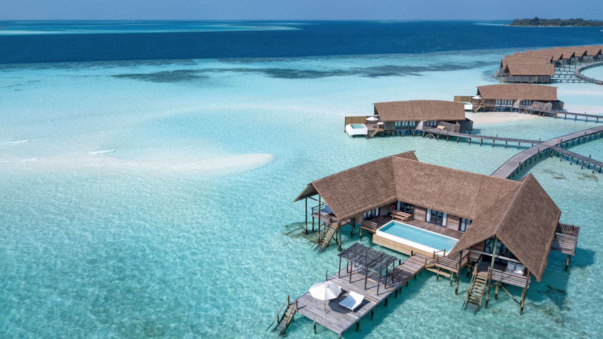 These light-filled villas sit on their own secluded jetty, each with a private entrance deck, surrounded by the aquamarine ocean. Outside, there’s a new private pool and a balcony with a daybed, where you can relax as the sun rises and sets on the ocean. Inside, the spacious living area with floor-to-ceiling windows provides plenty of space to unwind.